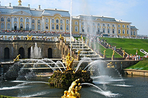 Nos encontramos no hotel às 9 ou 10 da manhã. Com o carro ou van privado. Vamos fora da cidade para conhecer a residência de verão de Pedro, o Grande, e que agora é o parque mais visitado na Rússia, o famoso Peterhof, localizado na beira do Mar Báltico. Entramos no Palacio Grande, o edifício mais luxuoso da residência.